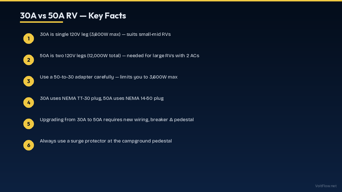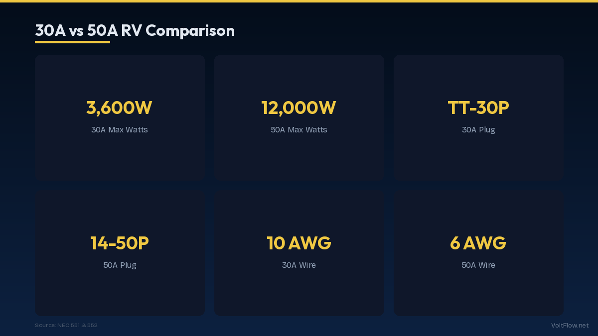 The difference between 30A and 50A RV service is massive: 30 amp gives you 3,600 watts on a single 120V leg, while 50 amp gives you 12,000 watts on two 120V legs. A 30A setup can run one AC plus a few small appliances. A 50A setup can run two ACs, a microwave, and more simultaneously. Choosing the right service depends on your RV size and power needs.