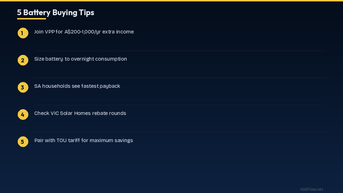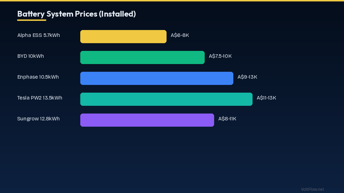 Home batteries in Australia cost A$5,000-15,000 installed. Tesla Powerwall 2: A$12,000. BYD HVS: A$8,000. VIC rebate covers A$2,950. Best paired with solar for TOU arbitrage and backup.