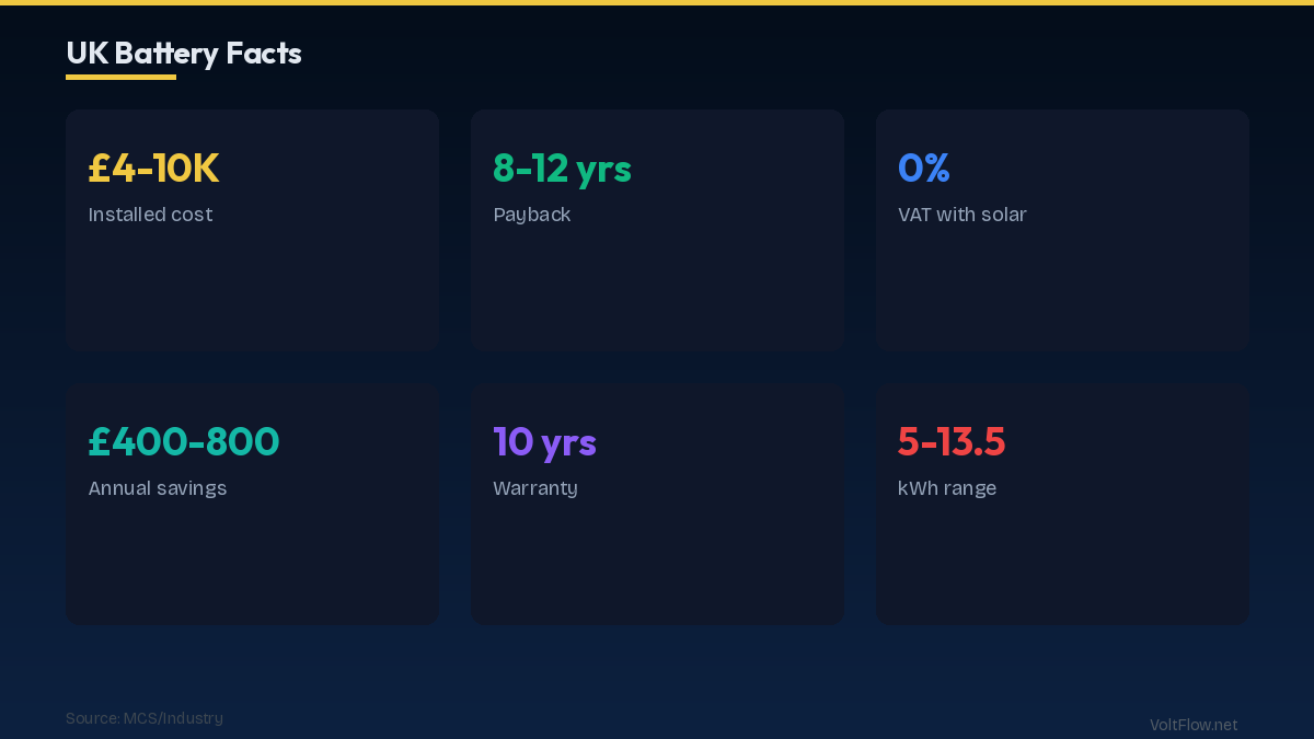 GivEnergy 5.2 kWh: £2,500 installed. Best value per kWh (£481/kWh). Good app and monitoring. Expandable to 10.4 kWh. Sunsynk 5.12 kWh: £2,800. Excellent hybrid inverter integration. Popular with UK installers. Fox ESS 5.2 kWh: £2,600. Good budget option with reliable performance. Tesla Powerwall (13.5 kWh): £8,000. Premium quality, backup power, whole-home coverage. Enphase IQ 5P (5 kWh): £3,500. Best for Enphase microinverter systems. All prices include installation and 0% VAT when paired with solar.