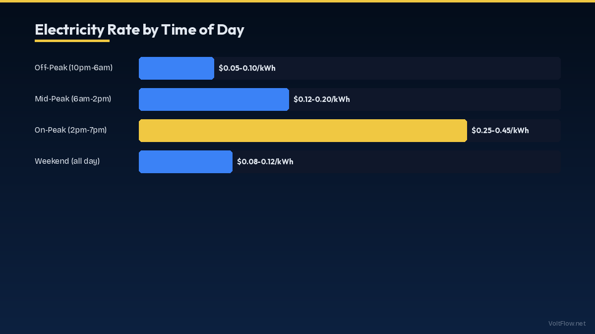 TOU rates charge different prices per kWh depending on the time of day. Off-peak (10pm-6am): Lowest rates, $0.05-$0.10/kWh. Grid demand is low. Mid-peak (6am-2pm, 7pm-10pm): Moderate rates, $0.12-$0.20/kWh. On-peak (2pm-7pm weekdays): Highest rates, $0.25-$0.50/kWh. This is when AC demand peaks in summer. Weekends: Often off-peak or mid-peak all day. Exact hours vary by utility — check your provider's TOU schedule.