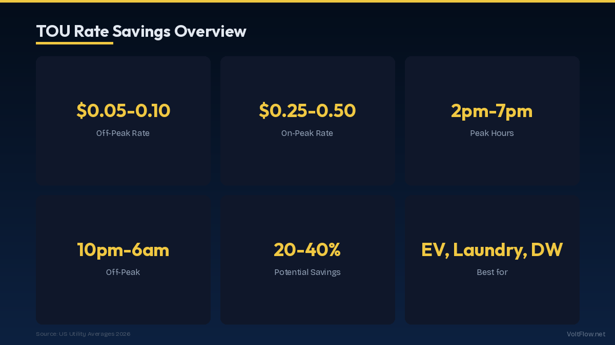 If your utility offers time-of-use (TOU) rates, running heavy appliances during off-peak hours (typically 10pm-6am) can save 20-40% on your electricity bill. Off-peak rates can be as low as $0.05-$0.10/kWh versus $0.25-$0.50/kWh during peak hours (2pm-7pm). The biggest savings come from shifting EV charging, laundry, dishwasher, and pool pump operation to overnight hours.
