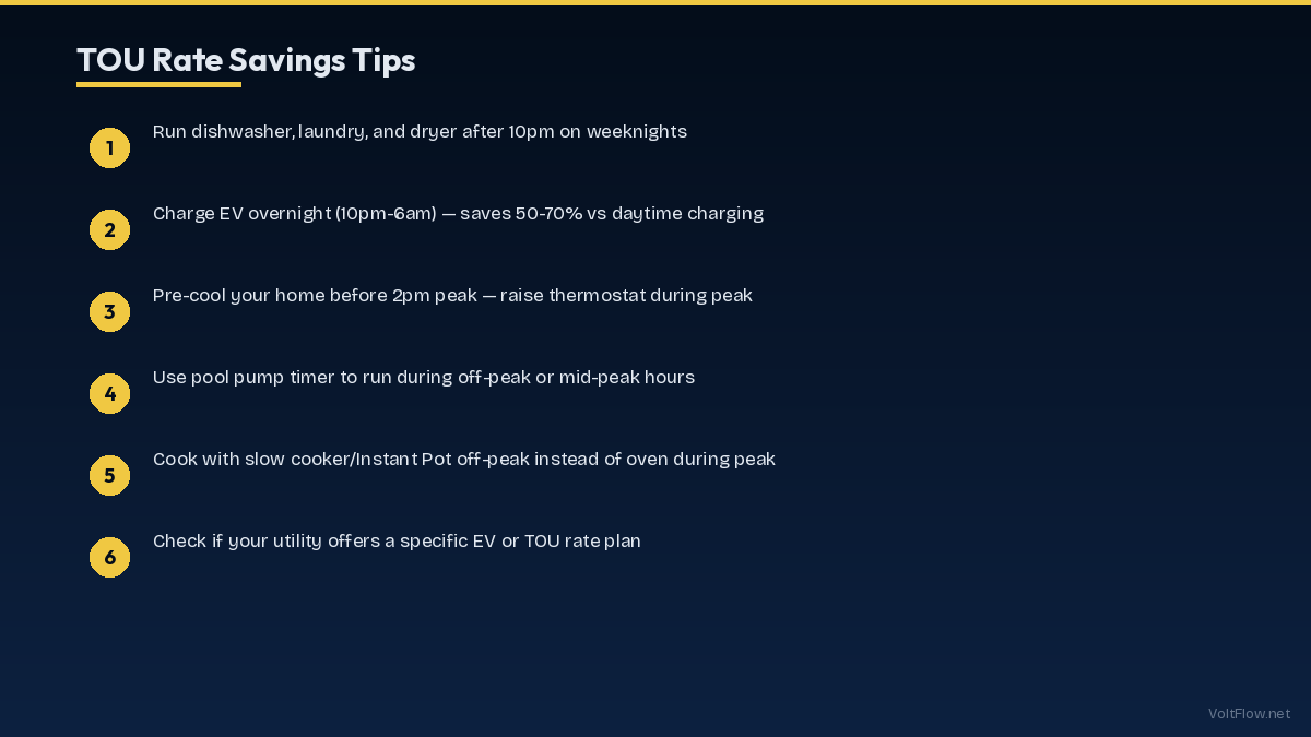 Modern smart home devices make TOU optimization automatic: Smart EV chargers (Tesla, JuiceBox, ChargePoint) have built-in scheduling — set once and forget. Smart thermostats (Ecobee, Nest) can pre-cool before peak hours and raise the setpoint during peak. Smart plugs with scheduling for pool pumps, water heaters, and other deferrable loads. Smart dishwashers and washers have delay-start features — load in the evening, start at 10pm automatically. The investment in smart controls ($200-500 total) pays for itself in 1-3 months of TOU savings.