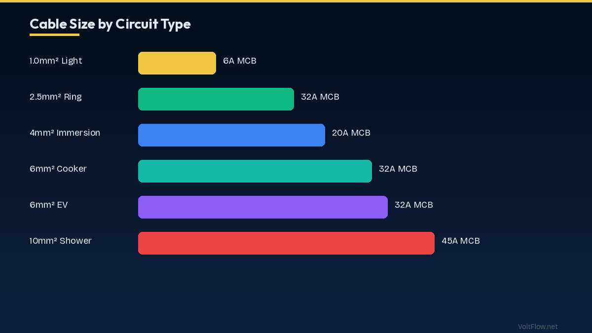 Lighting circuit (6A MCB): 1.0mm² T&E. Max 10-12 light points per circuit. CPC (earth): 1.0mm². Ring final (32A MCB): 2.5mm² T&E forming a ring. Serves general sockets in one floor/area. Maximum floor area: 100m². Radial socket (20A MCB): 2.5mm² T&E. Alternative to ring for smaller areas (up to 50m²). Cooker circuit (32-45A): 6.0mm² T&E on 32A MCB (most cookers) or 10.0mm² on 45A MCB (large range cookers). Electric shower (40-50A): 10.0mm² on 45A or 50A MCB for 9.5-10.5 kW showers. EV charger (32A): 6.0mm² on 40A Type C MCB per IET Code of Practice.