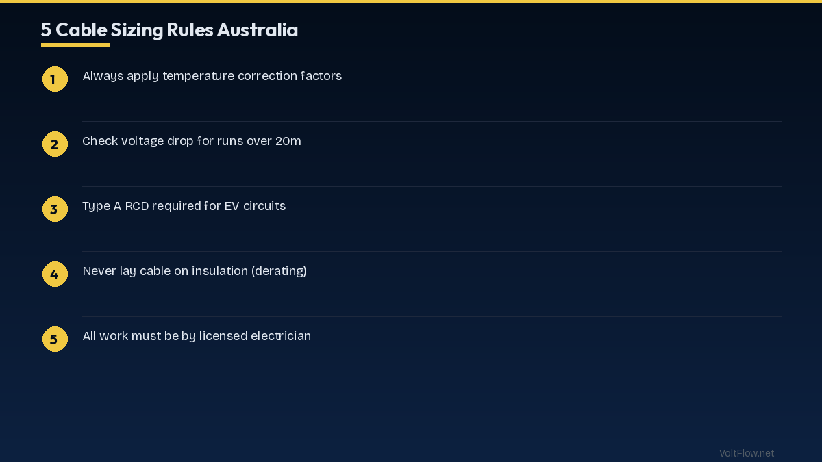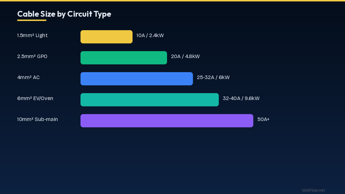 Australian cable sizing follows AS/NZS 3000 (Wiring Rules). Common sizes: 1.5mm² for lighting, 2.5mm² for power circuits, 6mm² for cookers and EV chargers. Correction factors for temperature are critical in Australian heat.