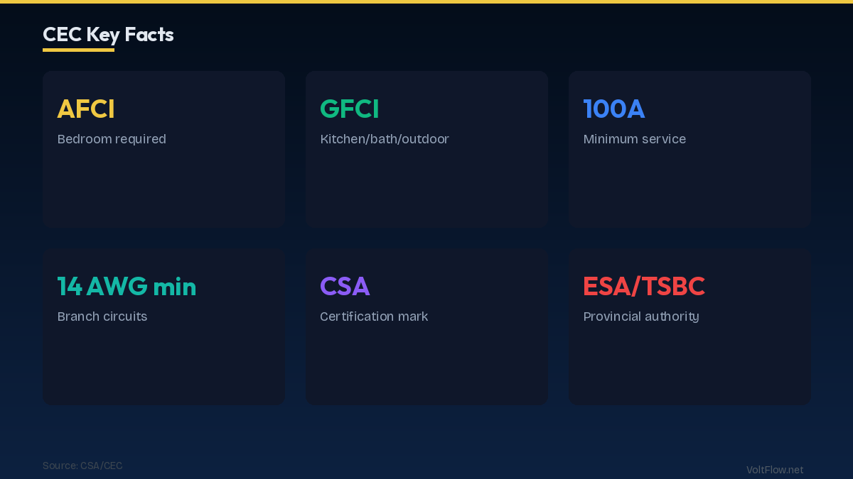 The Canadian Electrical Code (CEC) governs all electrical installations. Key differences from NEC: CEC allows 90°C ampacity for NMD90, limits 12 outlets per 15A circuit, and requires permits for most work.