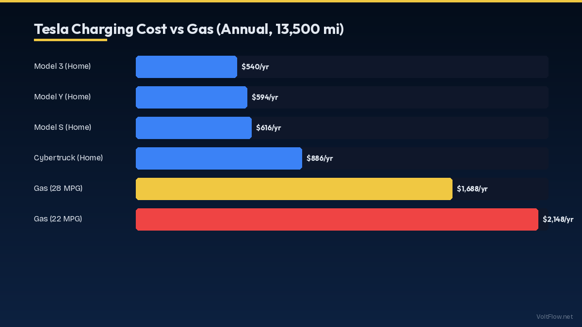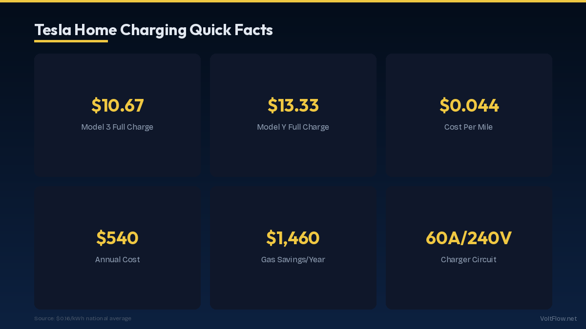 Charging a Tesla at home costs approximately $0.044 per mile at the US average electricity rate of $0.16/kWh — roughly 75% cheaper than gas. A full charge on a Model 3 costs about $10.67, Model Y about $12.00, and Model S about $16.00. Annual charging cost for 13,500 miles averages just $540-$620, compared to $1,700+ for gas.