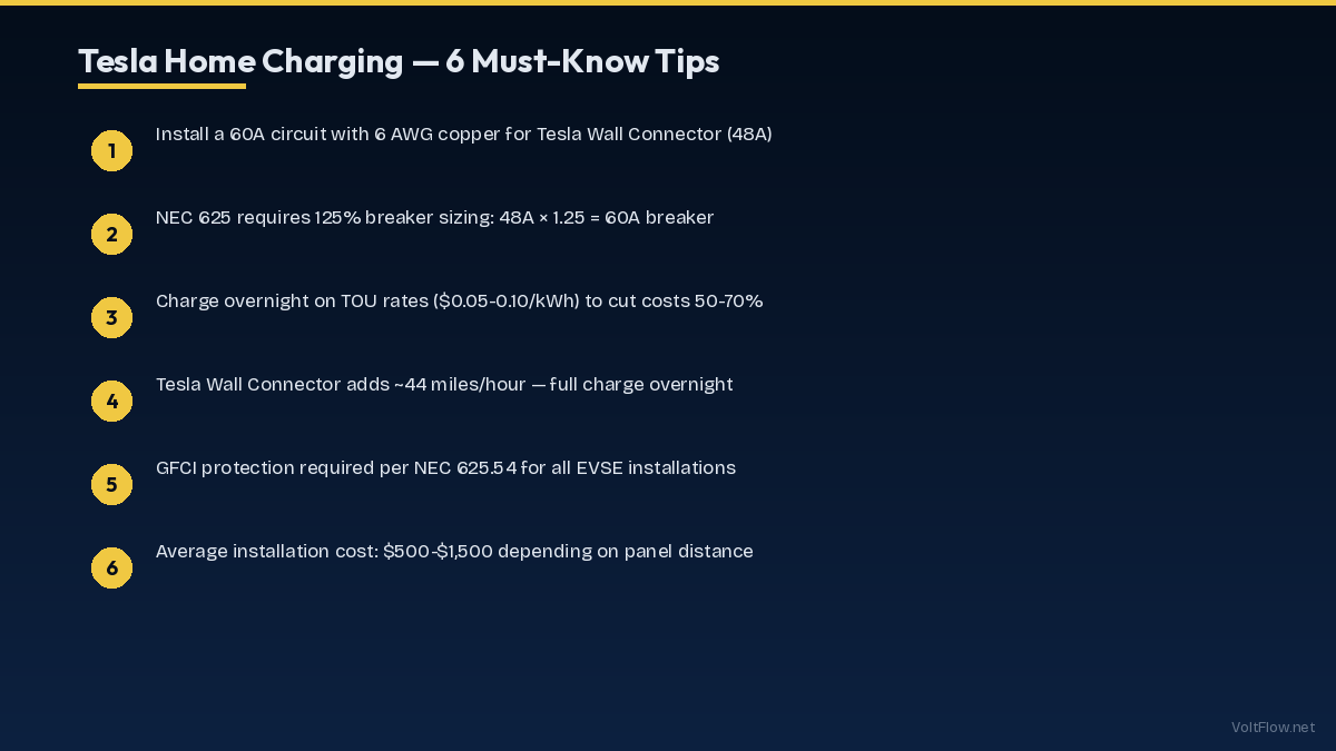 The Tesla Wall Connector draws 48A continuous and requires a 60A breaker per NEC 625 (48A × 1.25 = 60A for continuous loads). Wire: 6 AWG copper for up to 50 feet, or 4 AWG for longer runs. A NEMA 14-50 outlet (for the Tesla Mobile Connector at 32A) needs a 50A breaker with 6 AWG wire. NEC 625.54 requires GFCI protection for all EV charging equipment. See our EV Charger Breaker Guide.