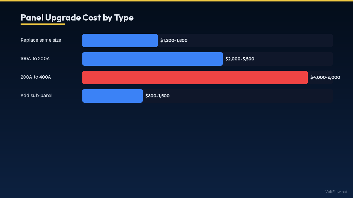 | Same-size replacement | $1,200-1,800 | 4-8 hrs | New panel, same service |