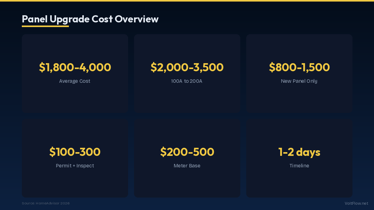 An electrical panel upgrade from 100A to 200A typically costs $2,000 to $3,500 including the new panel, meter base, labor, permits, and inspection. This is one of the most common home electrical upgrades — needed when adding EV chargers, heat pumps, hot tubs, or when the existing panel is outdated, overloaded, or a recalled brand (Federal Pacific, Zinsco).