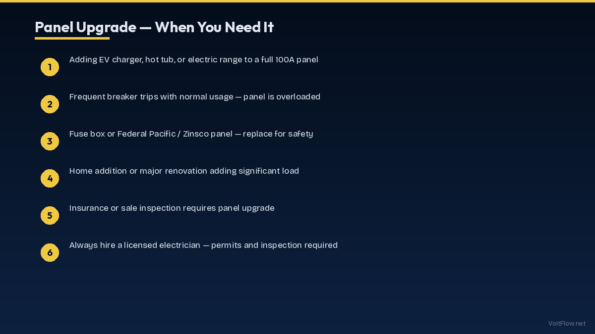 The most common triggers are: adding an EV charger to a full 100A panel, installing a heat pump or central AC, adding a hot tub (50A circuit), kitchen or bathroom remodel adding circuits, frequent breaker trips under normal use, panel is a recalled brand (Federal Pacific Stab-Lok, Zinsco, Pushmatic), insurance company or home inspector requires it, or planning solar panel installation with battery backup.