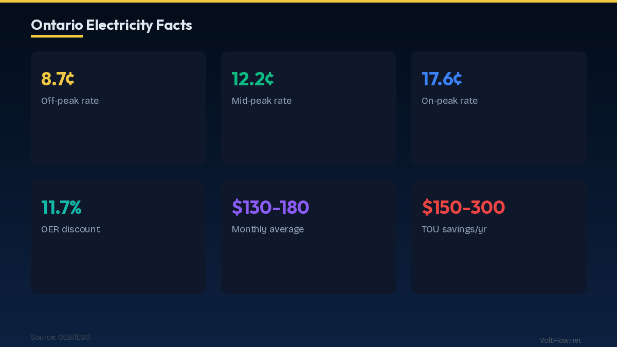 Ontario electricity rates: Off-peak 8.7¢, Mid-peak 12.2¢, On-peak 17.5¢. Ultra-Low Overnight: 2.8¢/kWh for EV and heating. Global Adjustment adds 5-10¢ to all-in cost.