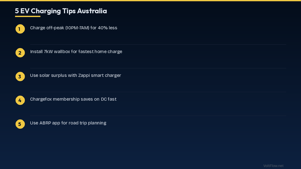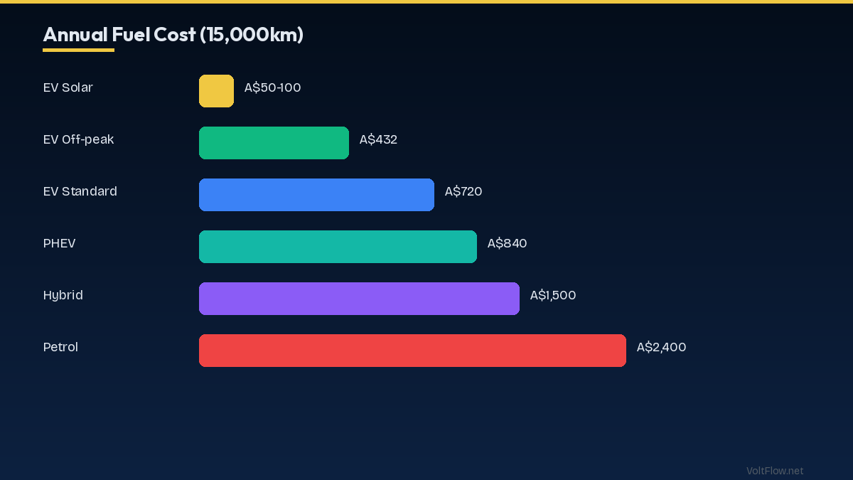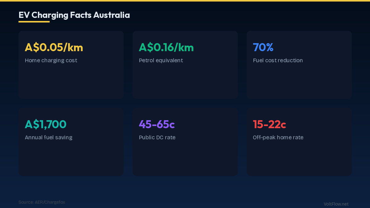 Home EV charging in Australia costs A$0.04-0.06/km at 30c/kWh. Public DC fast: A$0.10-0.15/km. Petrol equivalent: A$0.12-0.16/km. Annual savings: A$800-1,500.