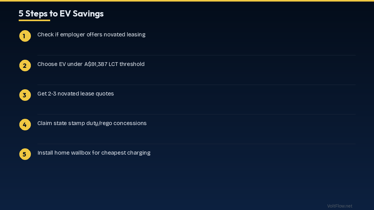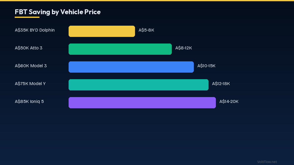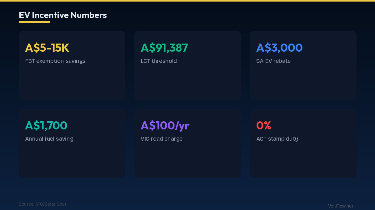 Australia offers FBT exemption for EVs under A$91,387 (saving A$5,000-15,000 for salary sacrifice). Some states offer additional stamp duty and registration discounts.