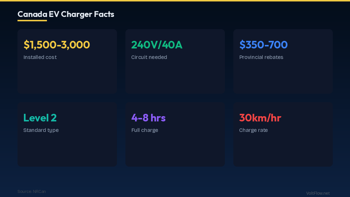 A Level 2 EV charger installation in Canada costs C$1,000-2,500. CEC requires 40A circuit for 32A charger. Provincial rebates: BC C$700, Quebec C$600.