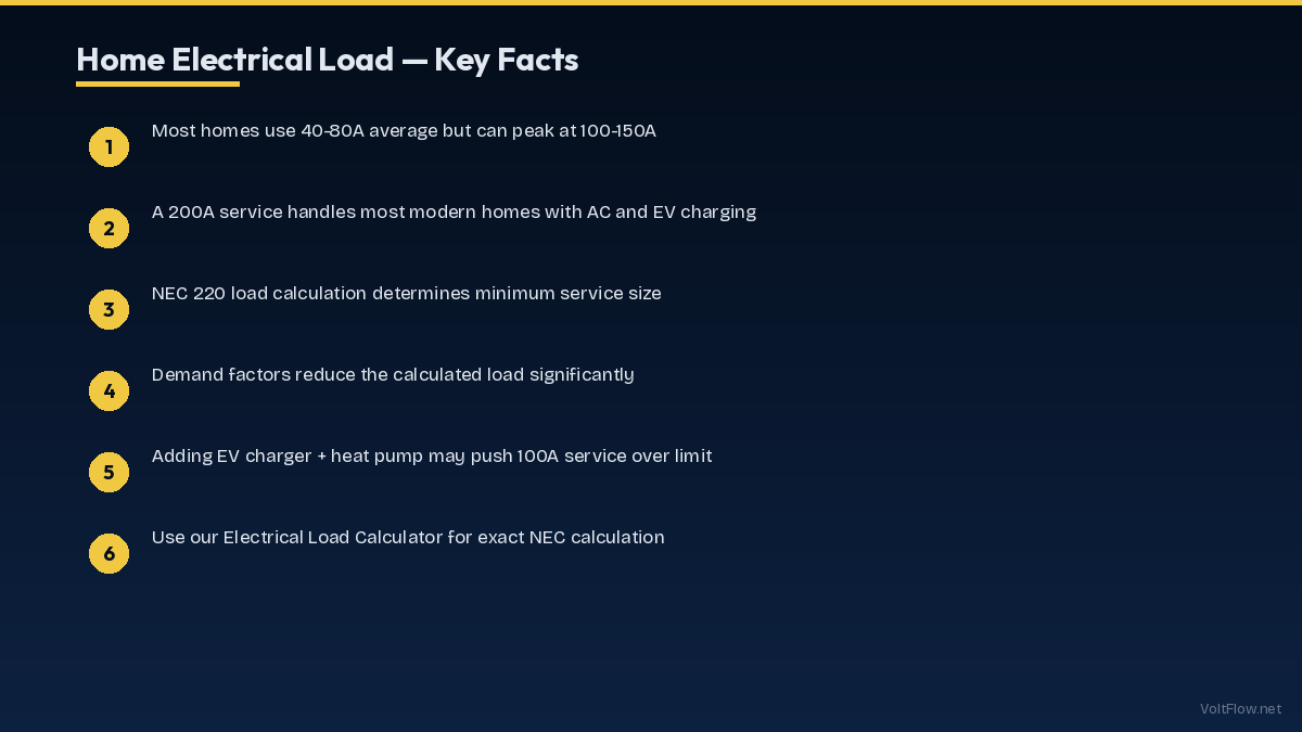 The NEC uses a standardized load calculation to determine minimum service size. Key elements: General lighting: 3 VA per sq ft (e.g., 2,000 sq ft = 6,000 VA). Small appliance circuits: 2 circuits × 1,500 VA = 3,000 VA. Laundry: 1,500 VA. First 10,000 VA at 100%, remainder at 40% (demand factor). Then add: AC or heat at 100%, range at NEC 220.55 demand, water heater, dryer, EV charger. The total calculated load determines the minimum service amperage. Use our Electrical Load Calculator for exact NEC calculations.