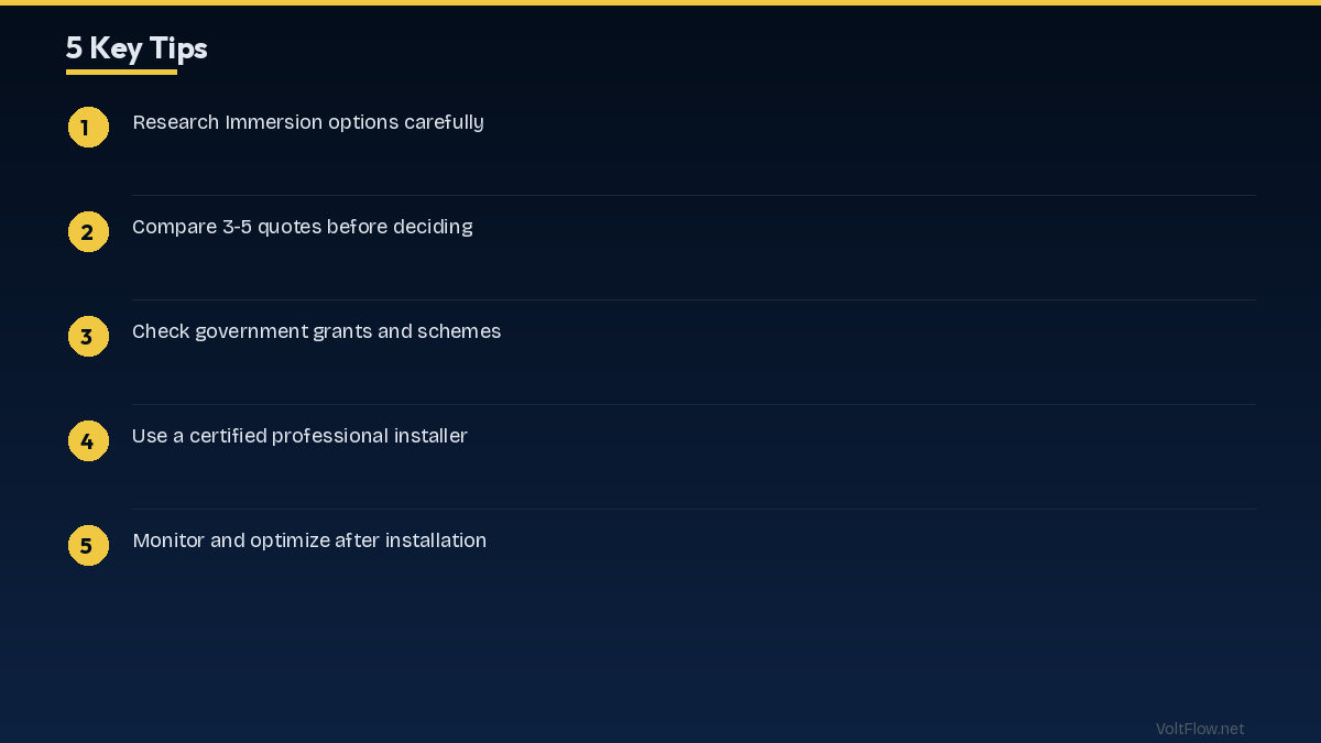 Set your immersion thermostat to 60°C. This is hot enough to kill Legionella bacteria (which multiply at 20-45°C) while not wasting energy on excessive heat. Every 10°C above 60°C increases running costs by approximately 10-15%. Never set below 50°C due to Legionella risk. If you have a solar thermal system or heat pump, the immersion serves as a backup boost — the primary system heats to 45-50°C and the immersion tops up to 60°C periodically for Legionella protection.