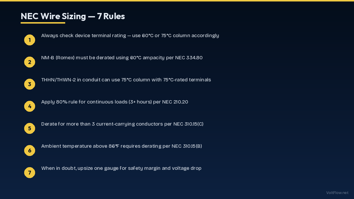 NEC Table 310.16 is the most referenced table in the National Electrical Code. It provides ampacity ratings for copper and aluminum conductors at three temperature ratings: 60°C, 75°C, and 90°C. This guide presents the complete table with explanations of when to use each column, derating factors, and practical wire sizing examples.