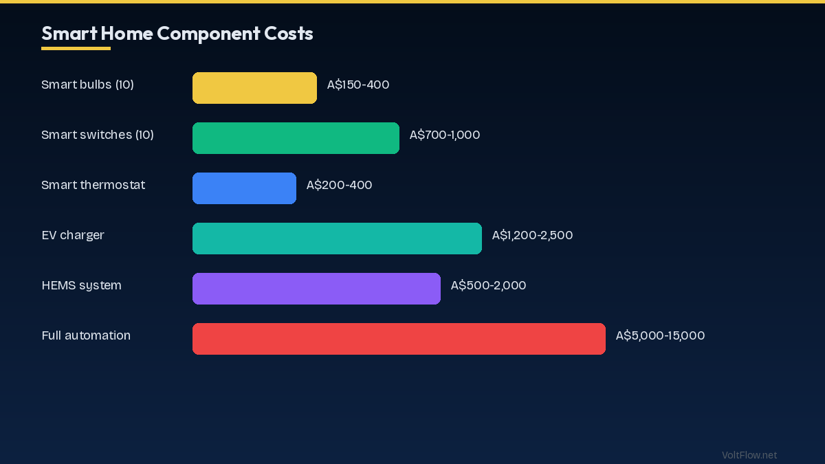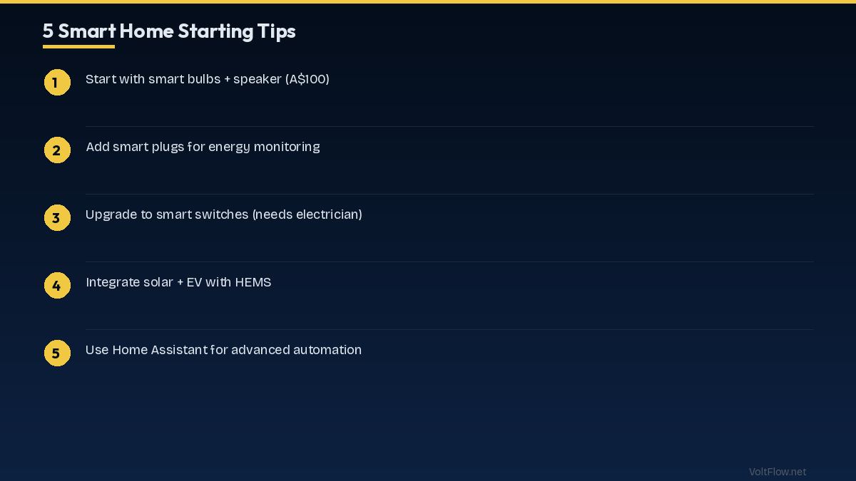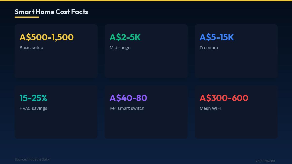 Smart home wiring in Australia must comply with AS/NZS 3000. Key requirements: RCDs on all circuits, licensed electrician for all work, structured cabling for Cat6.