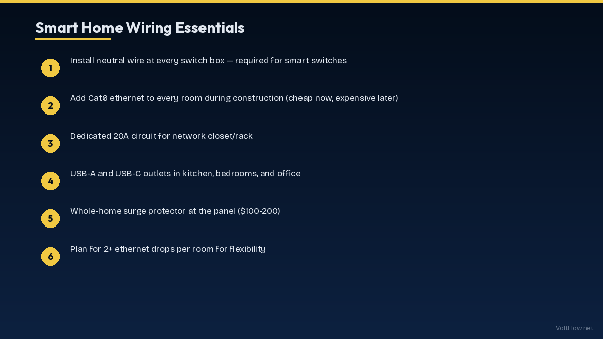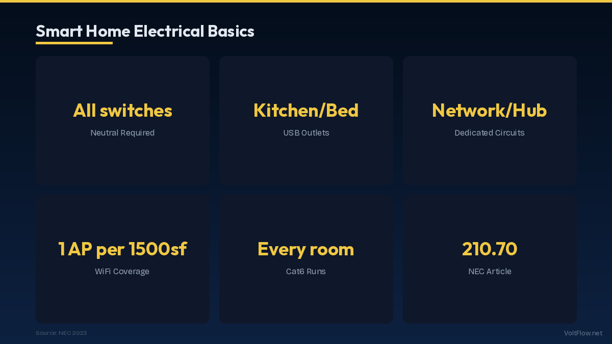 Building or upgrading a smart home requires specific electrical infrastructure that goes beyond standard wiring. The three most important requirements are: neutral wires at every switch box (required by NEC 404.2(C) and needed for smart switches), Cat6 ethernet drops in every room, and dedicated circuits for networking equipment. Planning these during construction costs a fraction of retrofitting later.