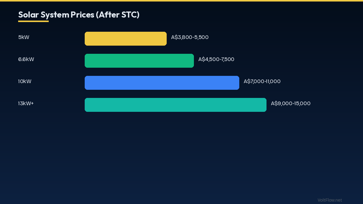 A 6.6kW solar system in Australia costs A$4,500-7,000 after the STC rebate (saves ~A$2,500). Payback: 3-6 years. Australia has the highest residential solar adoption in the world.