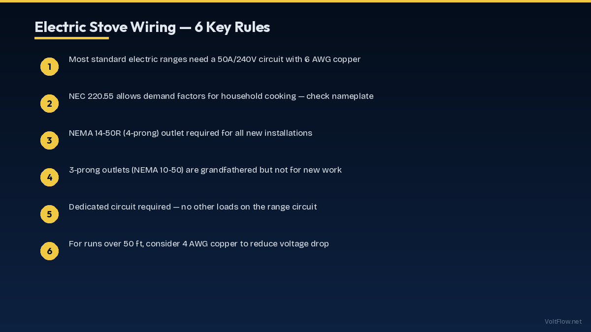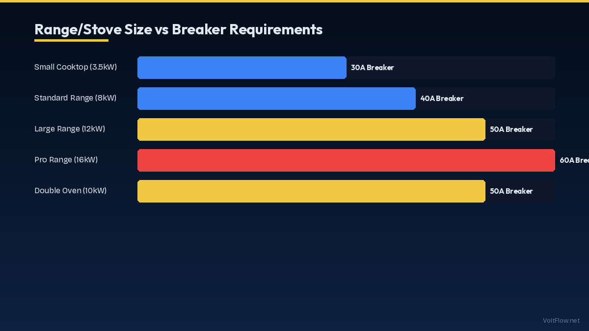 Not all ranges need 50A. Small cooktops drawing 3-4 kW may only need a 30A circuit with 10 AWG wire. Standard freestanding ranges (8-12 kW) use a 50A circuit. Professional ranges with multiple ovens and high-BTU burners (12-16 kW) may need a 60A circuit with 4 AWG wire. Always check the nameplate on your specific appliance — the manufacturer's rating determines the minimum circuit size.