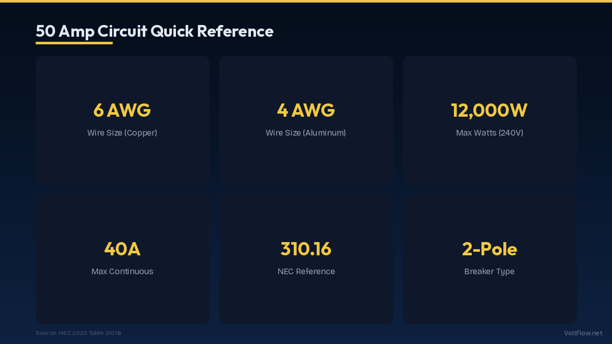 Per NEC Table 310.16, a 50 amp circuit requires 6 AWG copper wire rated at 65 amps (75°C column) or 4 AWG aluminum wire rated at 65 amps. This applies to standard residential installations using NM-B (Romex) cable, THHN/THWN-2 in conduit, or UF-B for underground runs.